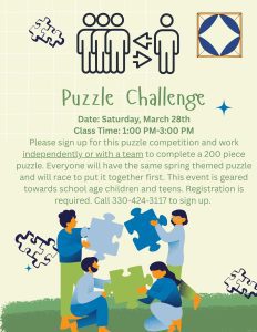 Please sign up for this puzzle competition and work independently or with a team to complete a 200 piece puzzle. Everyone will have the same spring themed puzzle and will race to put it together first. This event is geared towards school age children and teens. Sign up is required. Please call the library at (330) 424-3117 to sign up.